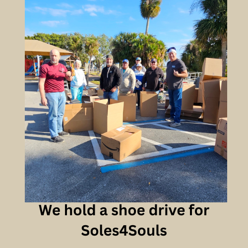 Gather all those unused footwear gathering dust in your closets and drop them off at the Park. We will be waiting for you! We box them up and ship them to the non-profit organization Soles4Souls who then ship them off to those who need footwear around the world.